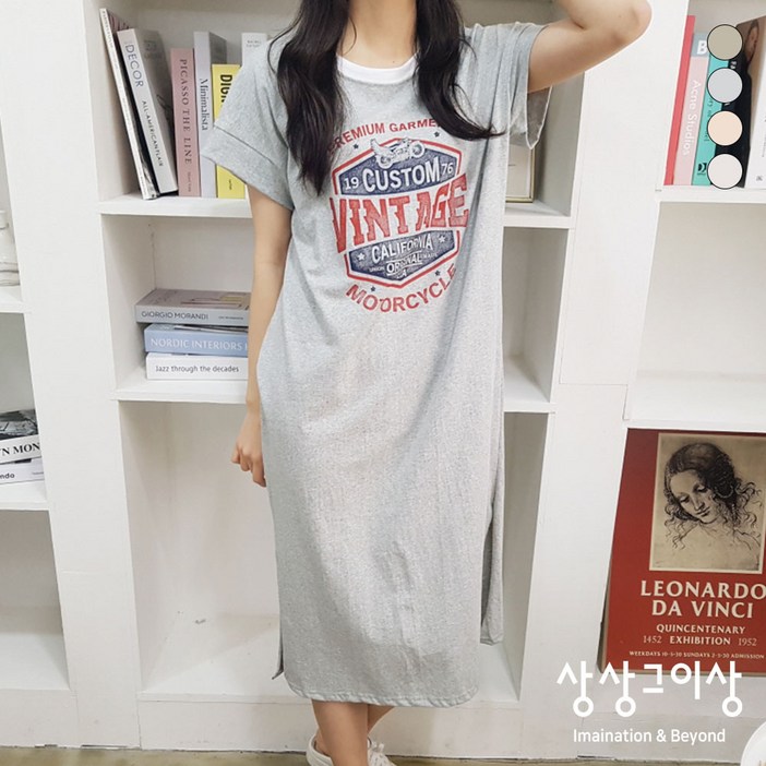 상상그이상 여성용 국내제작 커스텀 배색 반팔 롱 원피스 베이직핏 빈티지나염 면소재 홈웨어룩 라운드 배색 데일리룩