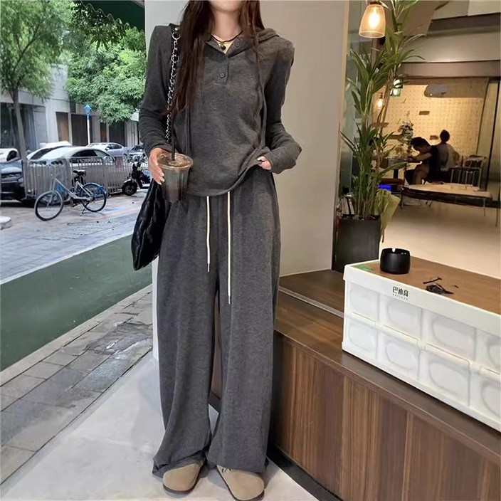 피어니스트 루즈핏 후드넥 긴팔 상의 와이드팬츠 투피스 세트