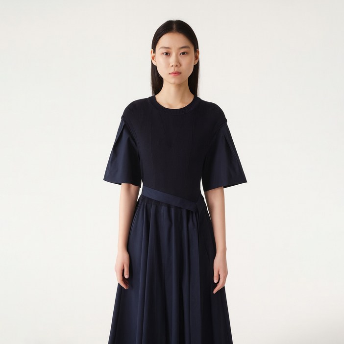 온앤온 여성용 니트 배색 제천 벨트 플리츠 원피스