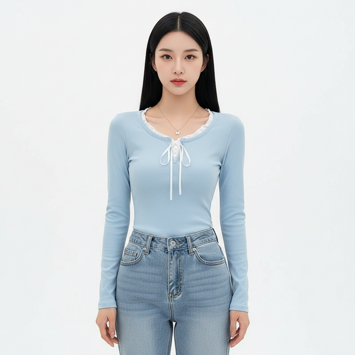 마켓피아 여성용 슬림핏 리본 프릴넥 긴팔 티셔츠
