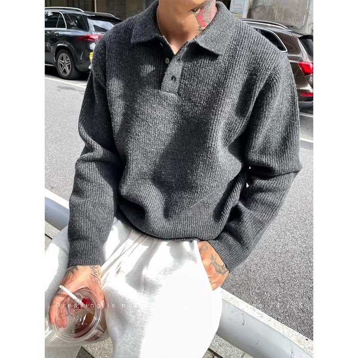 ANYOU 남성 카라 니트 오버핏 캐주얼 스웨터 맨투맨 두꺼운 긴팔 티셔츠